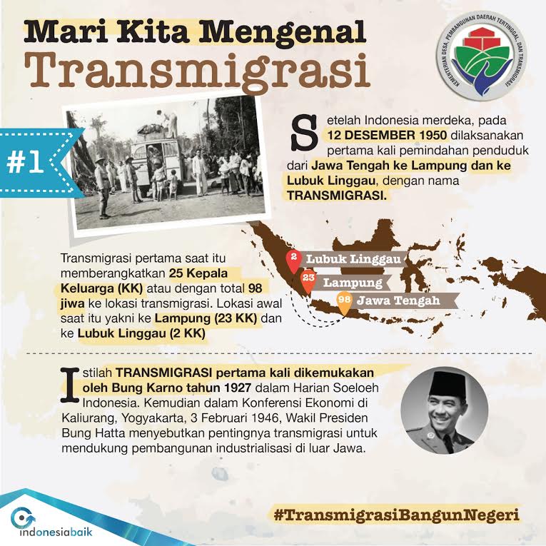 Istilah transmigrasi pertama kali dikemukakan oleh Bung Karno tahun 1927 dalam Harian Soeloeh Indonesia. Kemudian dalam Konferensi Ekonomi di Kaliurang, Yogyakarta, 3 Februari 1946, Wakil Presiden Bung Hatta menyebutkan pentingnya transmigrasi untuk mendukung pembangunan industrialisasi di luar Jawa.