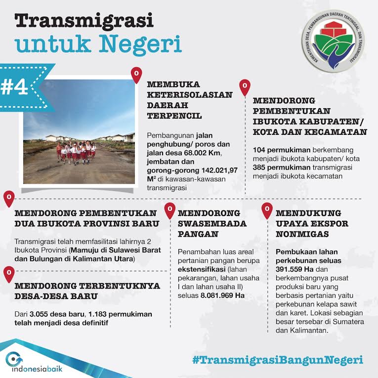 Sejumlah kontribusi positif dari program transmigrasi yakni, pertama, membuka keterisolasian daerah terpencil. Data mencatat, program transmigrasi telah berkontribusi pada pembangunan jalan penghubung/ poros dan jalan desa sepanjang 68.002 kilometer serta jembatan dan gorong-gorong sepanjang 142.021,97 M 2 di kawasan-kawasan transmigrasi.