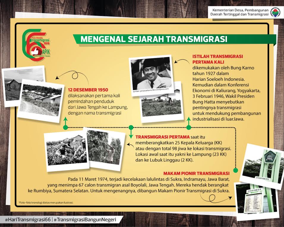Secara historis, permulaan penyelenggaraan transmigrasi dilaksanakan pada tanggal 12 Desember 1950. Transmigrasi pertama pada tahun 1950 saat itu memberangkatkan 25 Kepala Keluarga (KK) atau dengan total 98 jiwa. Lokasi awal saat itu yakni ke Lampung (23 KK) dan ke Lubuk Linggau (2 KK).